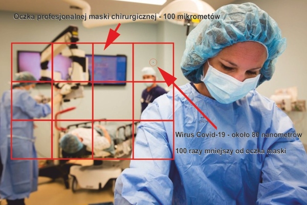 Co jeszcze? Ot, choćby maseczki. Miliony ludzi stroją się w nie w przekonaniu, że dają odpór wrażemu koronawirusowi, nie mając zielonego pojęcia, że nie tylko nie dają żadnego odporu, ale działają na swoją własną szkodę i narażają się na zachorowanie oddychając przez te maseczki, które blokują oddech i zawilgocone stają się gigantycznym siedliskiem bakterii. Maski, nawet te profesjonalne stosowane przez chirurgów podczas operacji przed wirusami nie chronią w ogóle. Nie mogą, ponieważ oczko najlepszej maski ma średnicę 100 mikronów, podczas gdy wirus grypy, w tym Covid-19 ma średnicę ok. 80-120 nanometrów, a więc średnio jest 100 razy mniejszy (!) od oczka w najlepszej masce chirurgicznej, zatem nakładanie masek na twarz, abstrahując od ich szkodliwości, to mniej więcej tak, jakby wielką siatką o wielkości oczka 1 metr próbować łapać 1-centymetrową muchę. Kompletny obłęd.